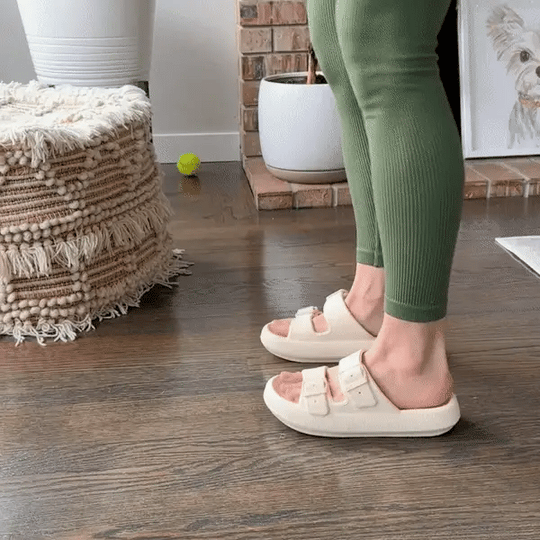 The Qomfort Pillow Sandals feature an orthopedic design with a 15° angle from toe to heel, evenly distributing pressure from your feet to your hips.You'll notice immediate alleviation of discomfort in your feet, ankles, knees, and hips.